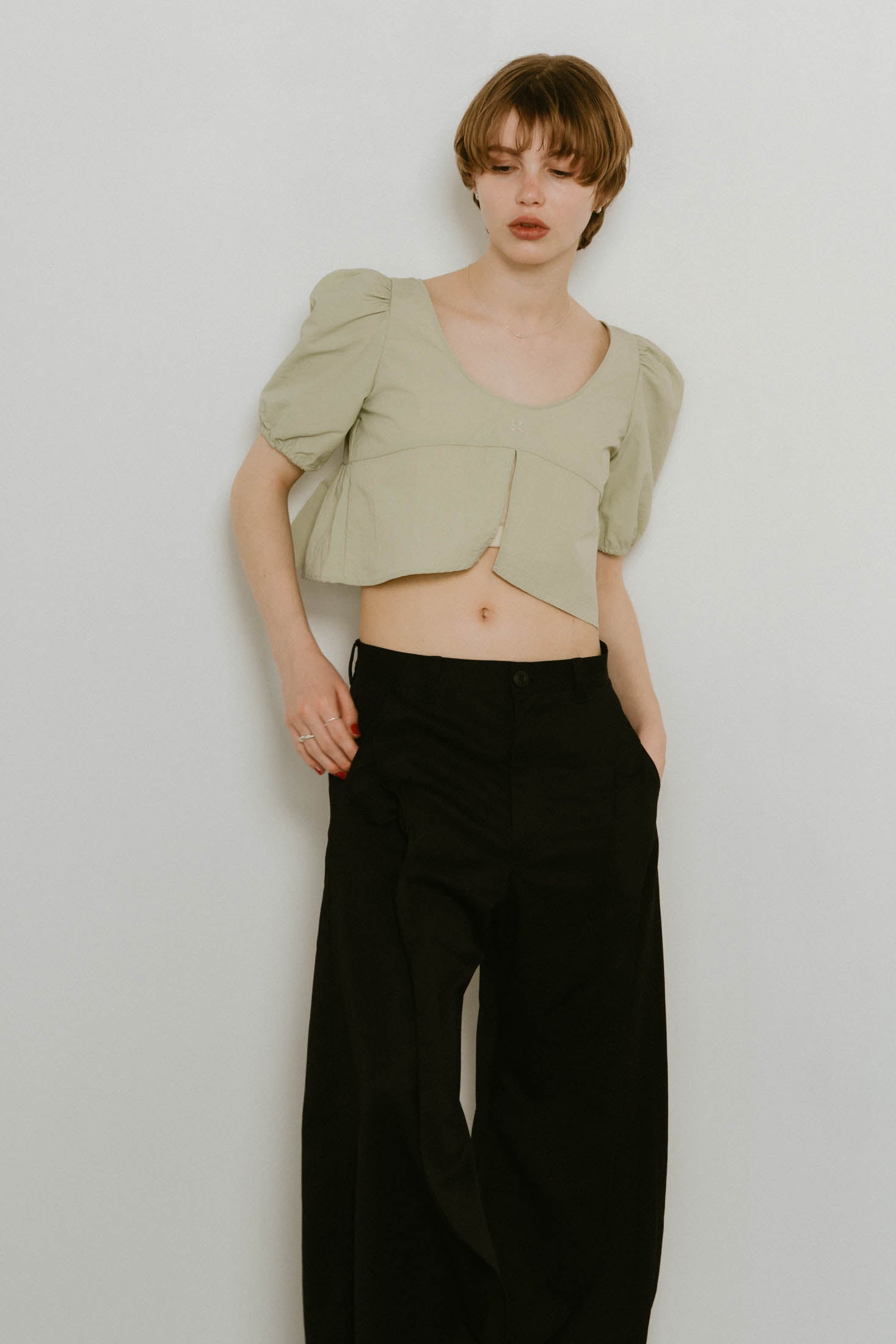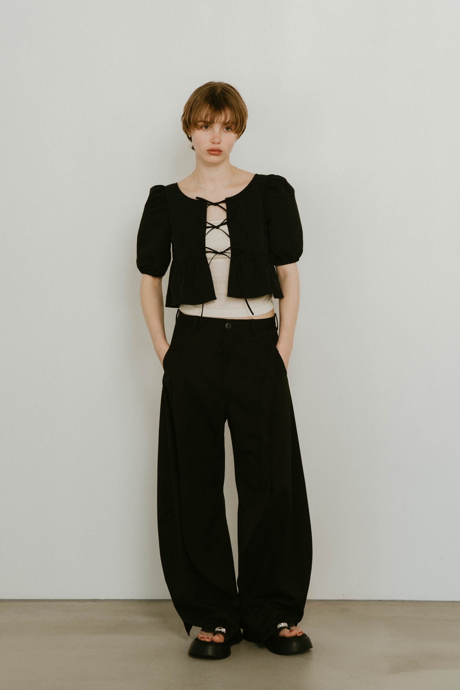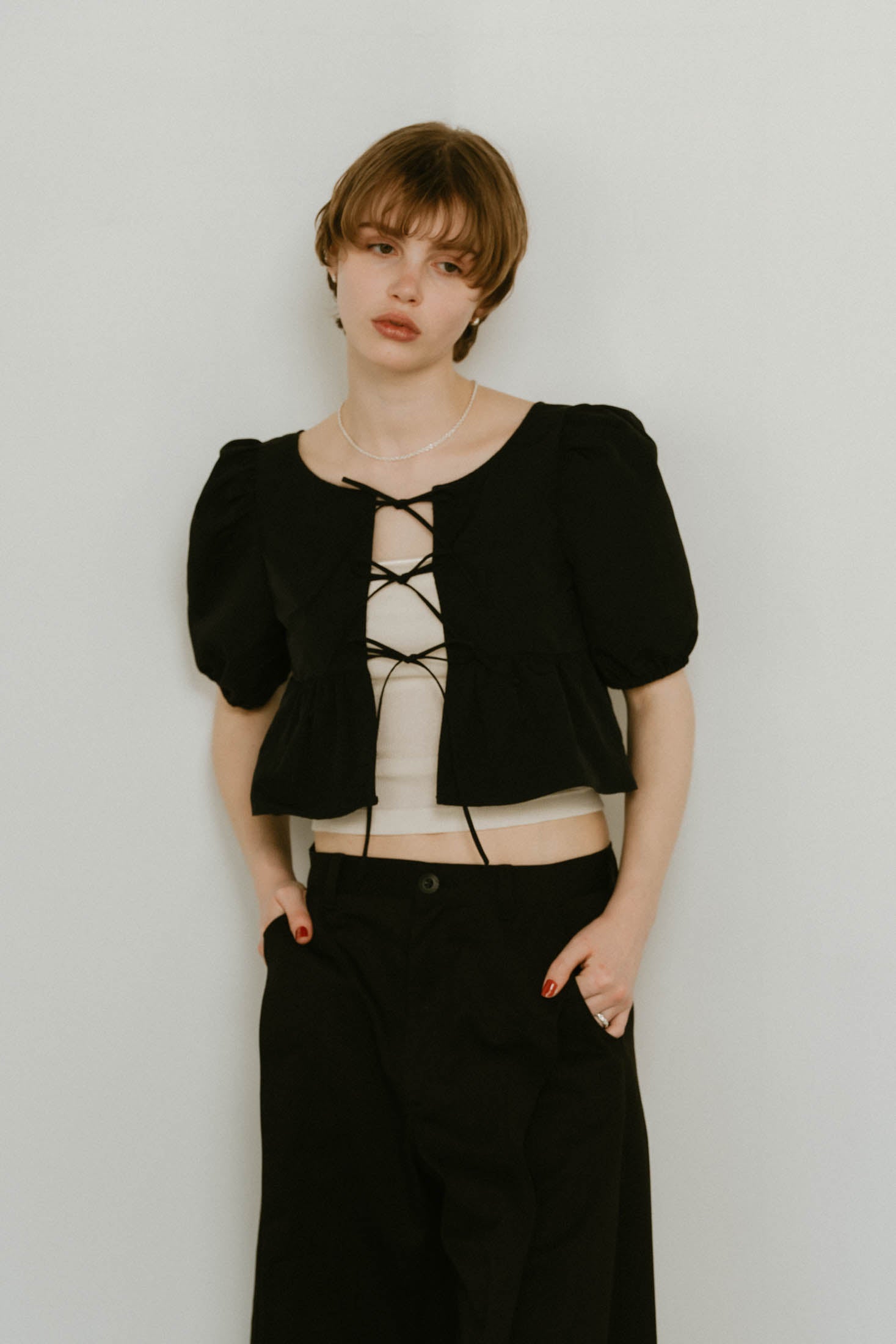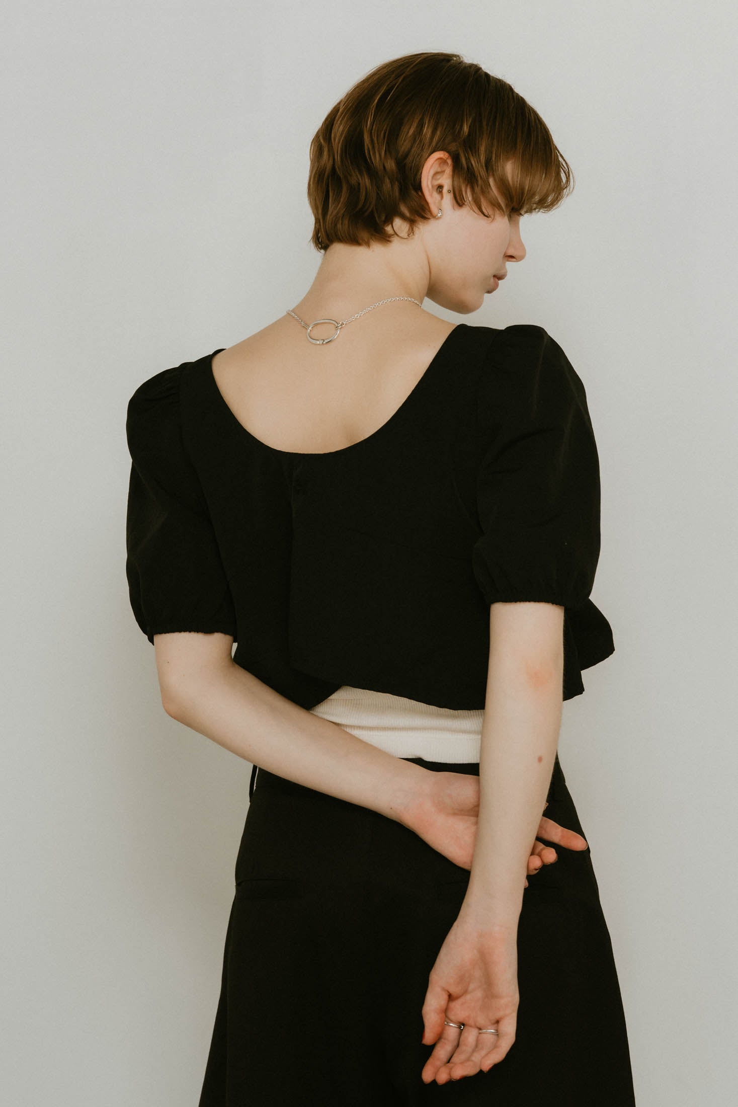 シャープなネックラインとパフスリーブの相乗効果で、