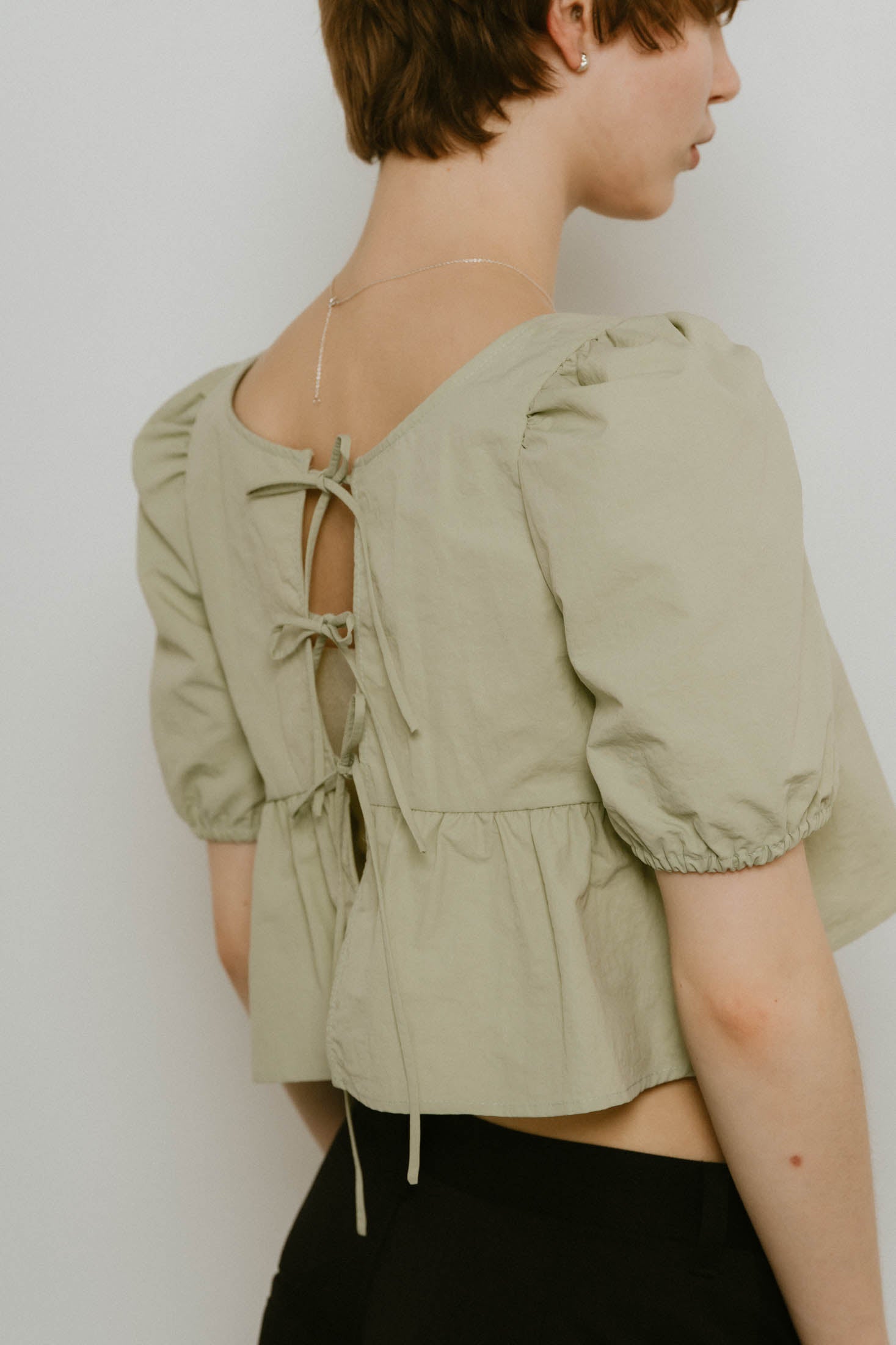 前後で着られる2wayのパフスリーブブラウス。