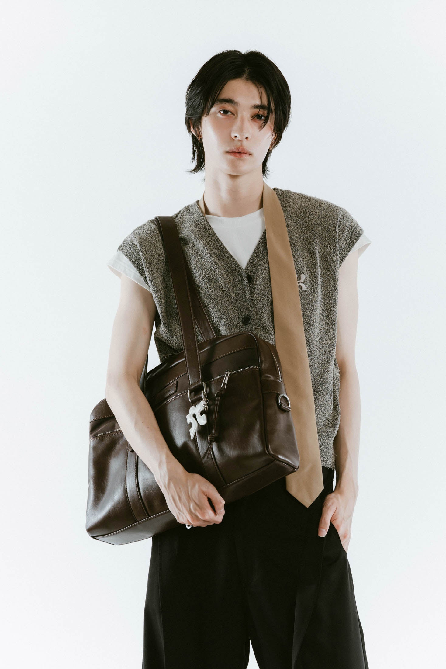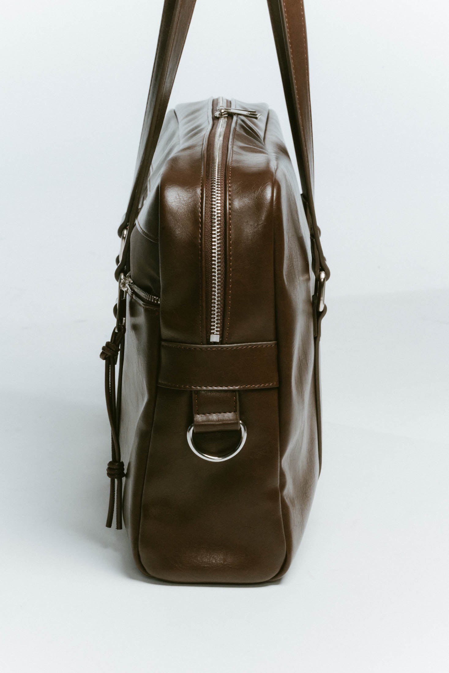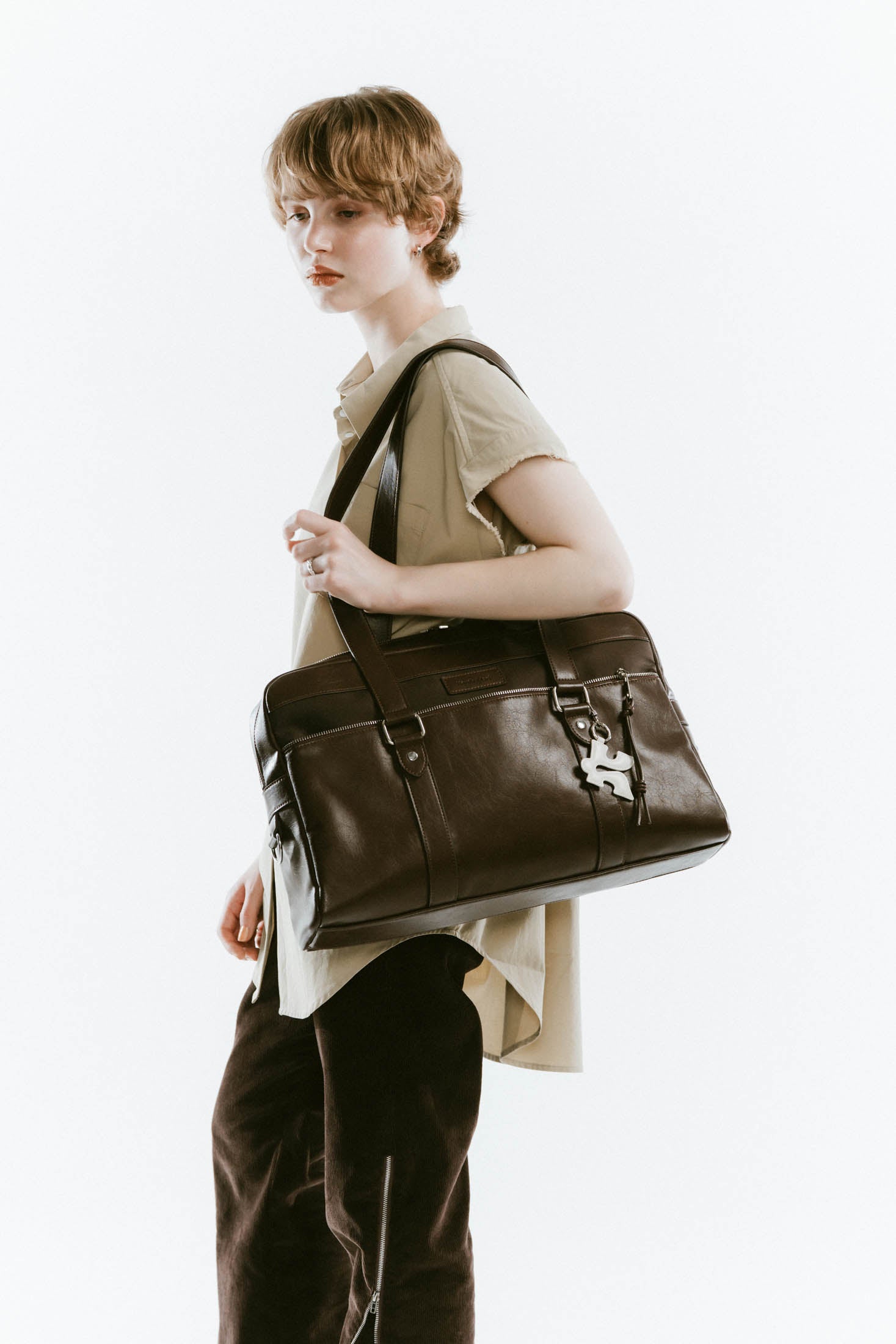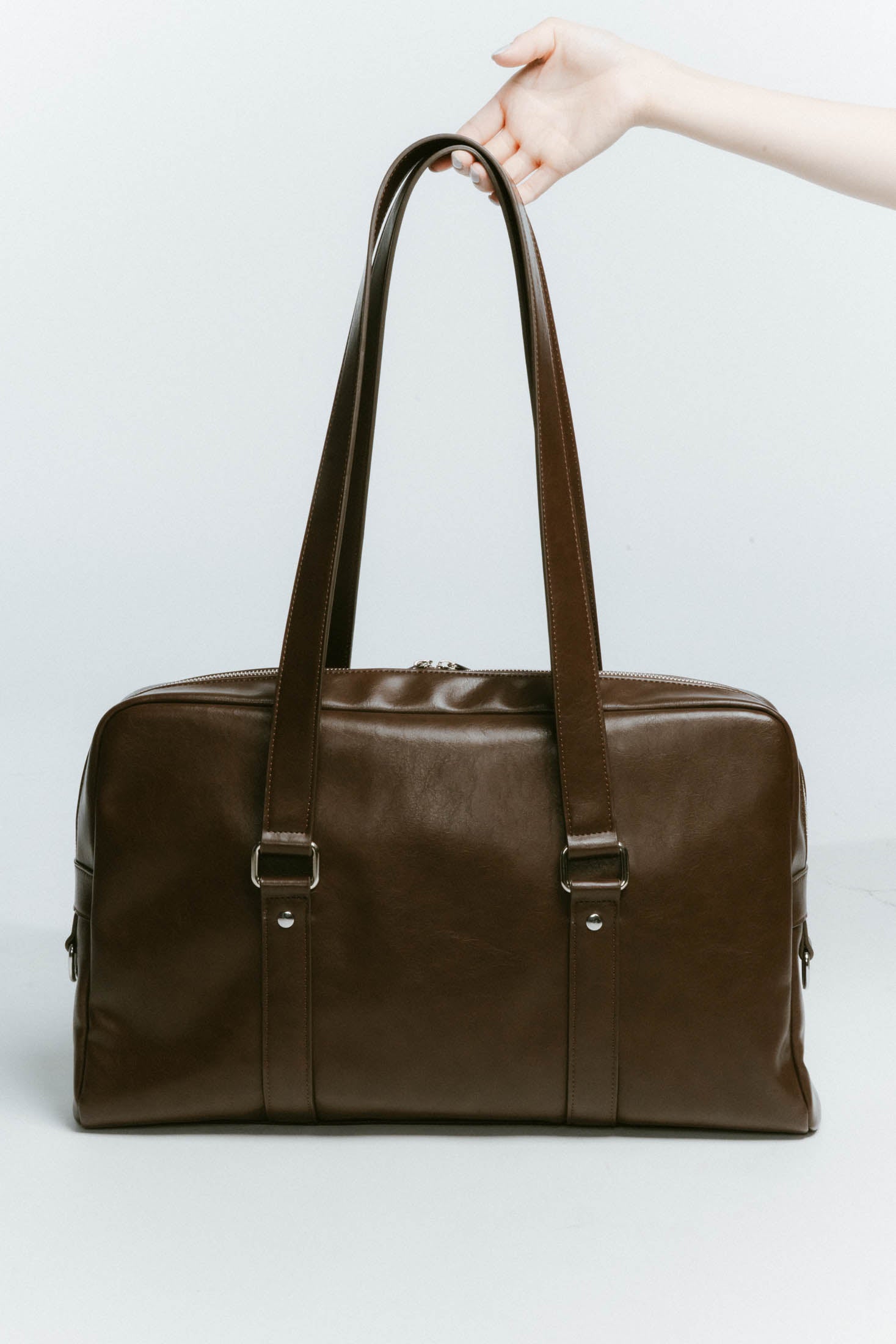 リッチなツヤ感とほどよい柔らかさのレザーで、大きめでもどこか抜け感が出る。