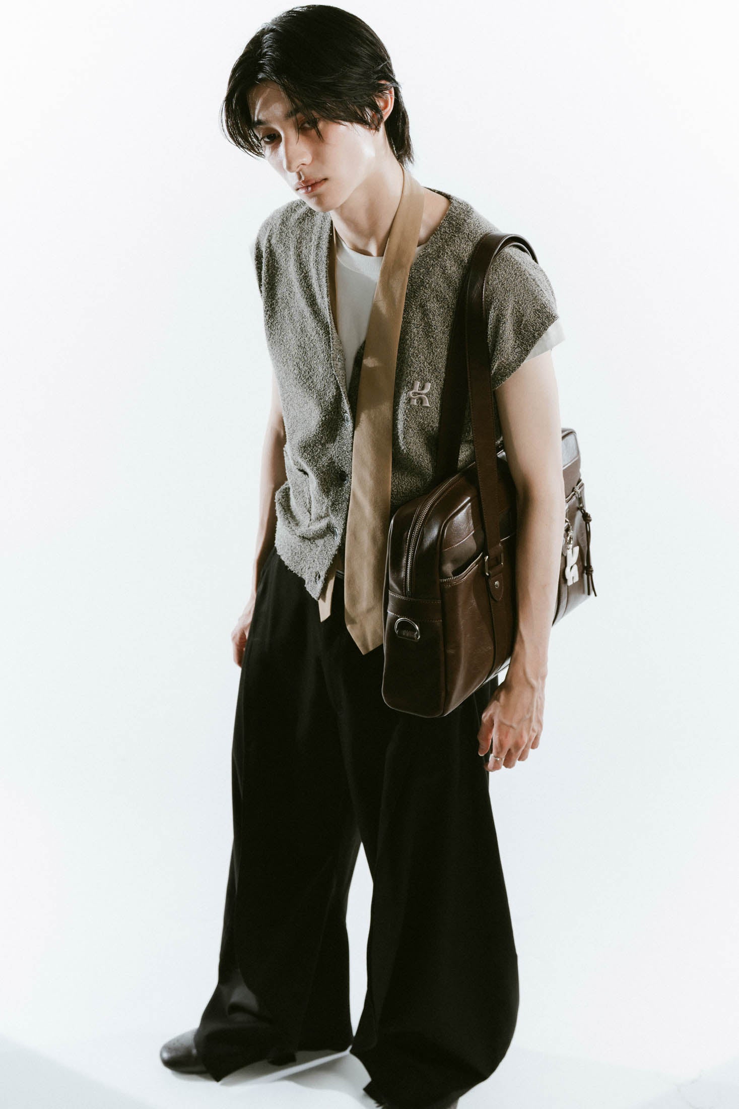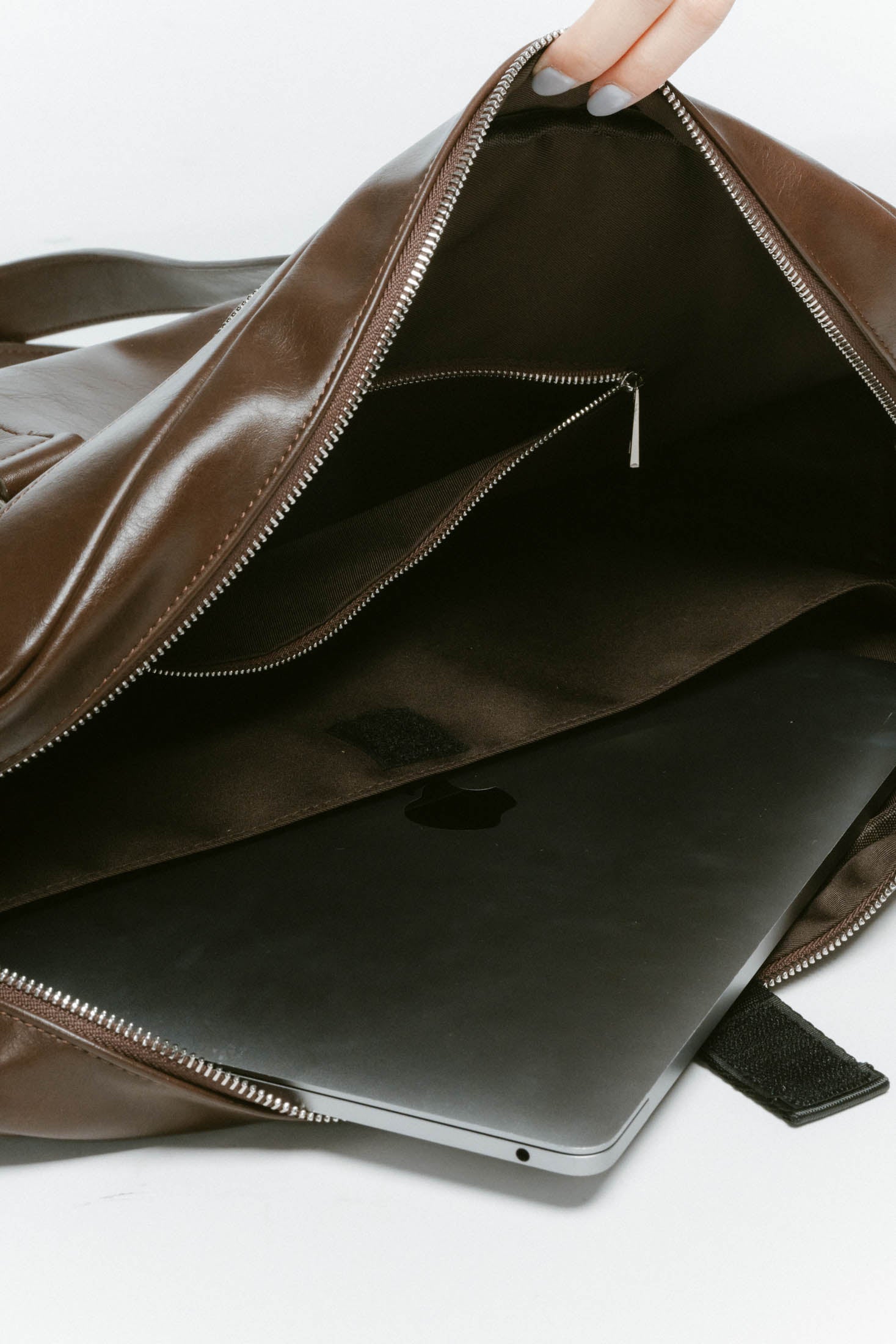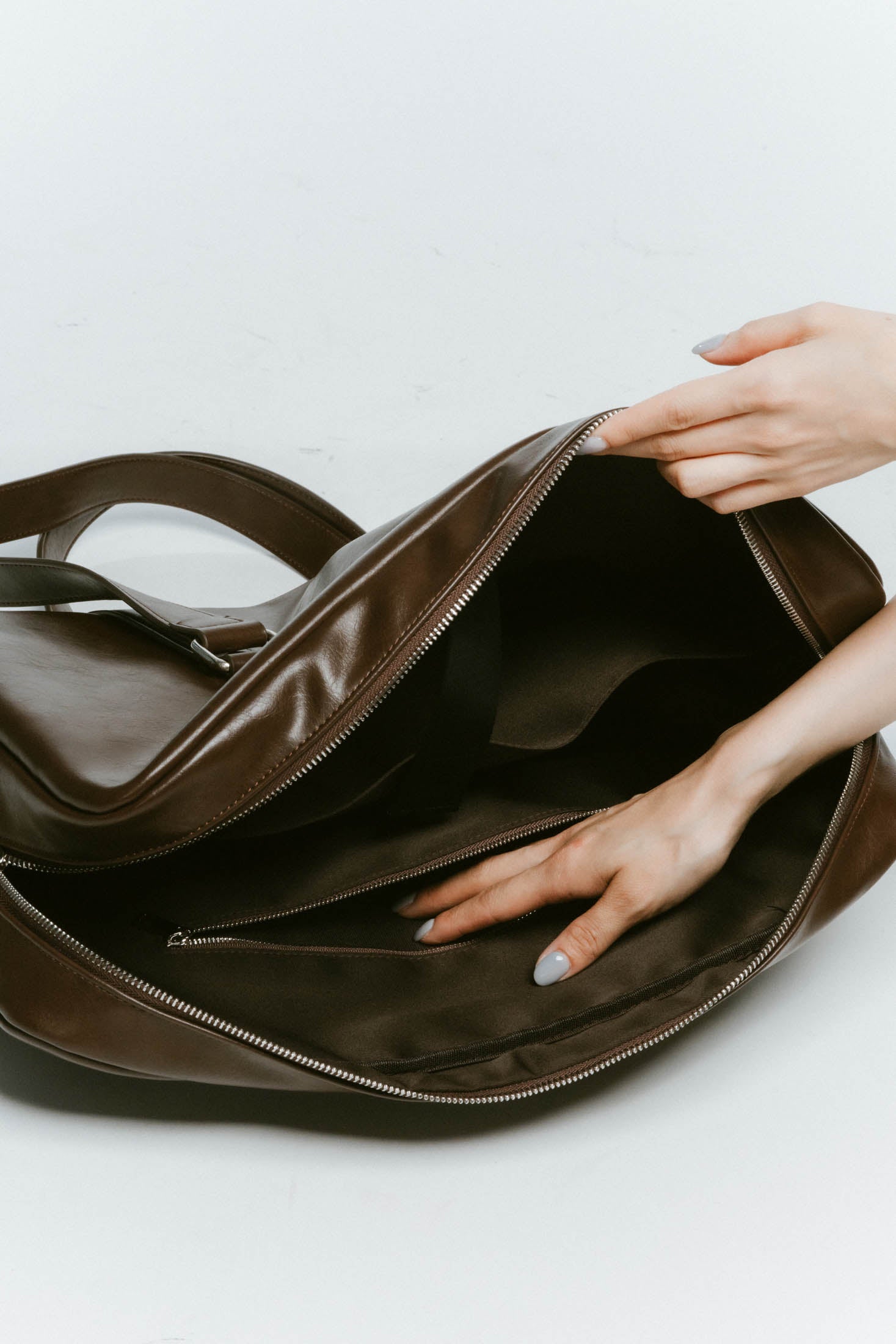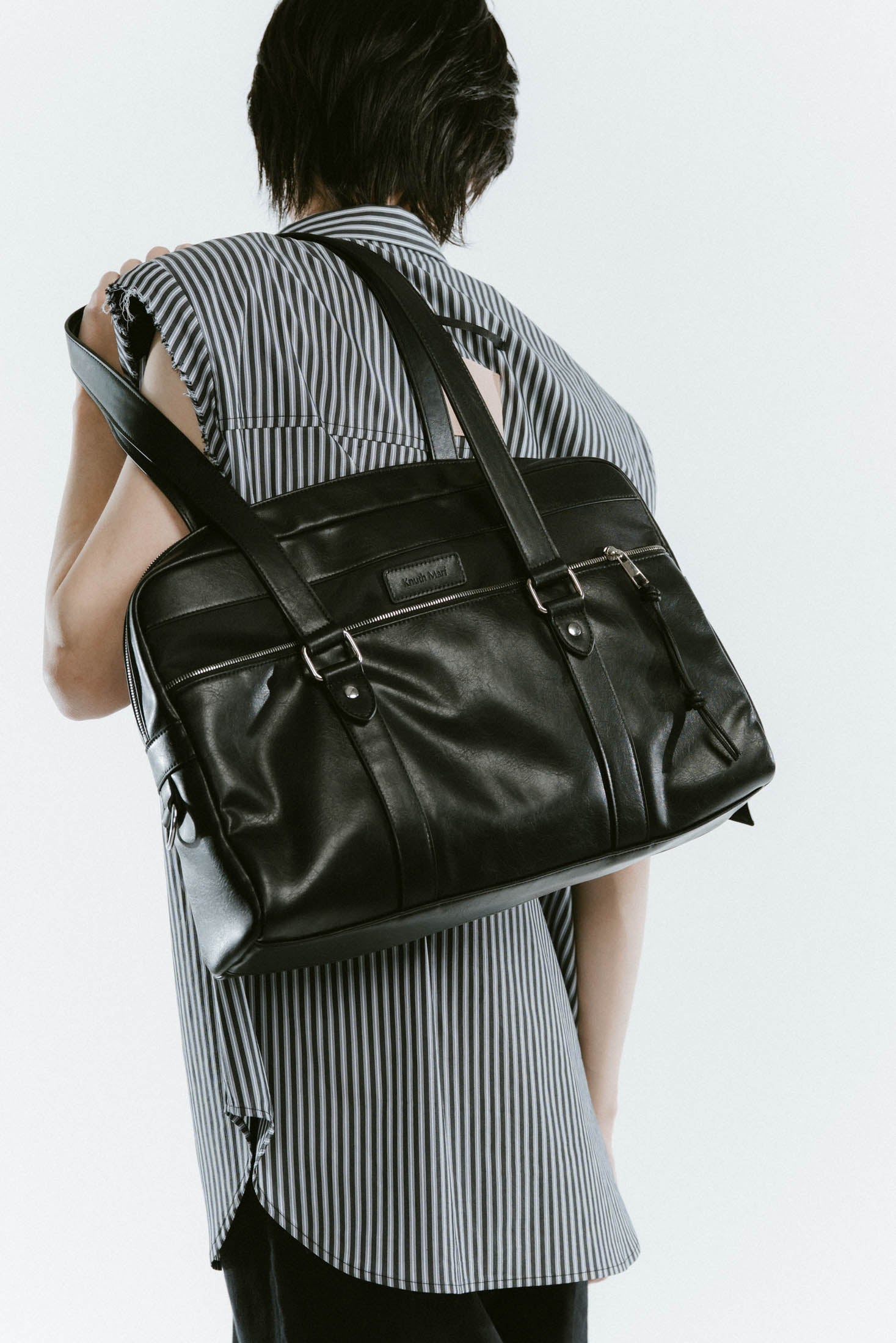 リッチなツヤ感とほどよい柔らかさのレザーで、大きめでもどこか抜け感が出る。