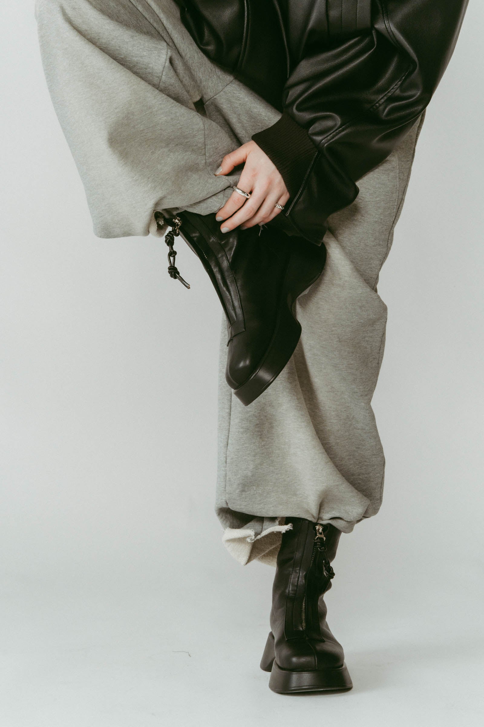 フロントジップと結び目のディテールが静かな主張を添えるブーツ。
