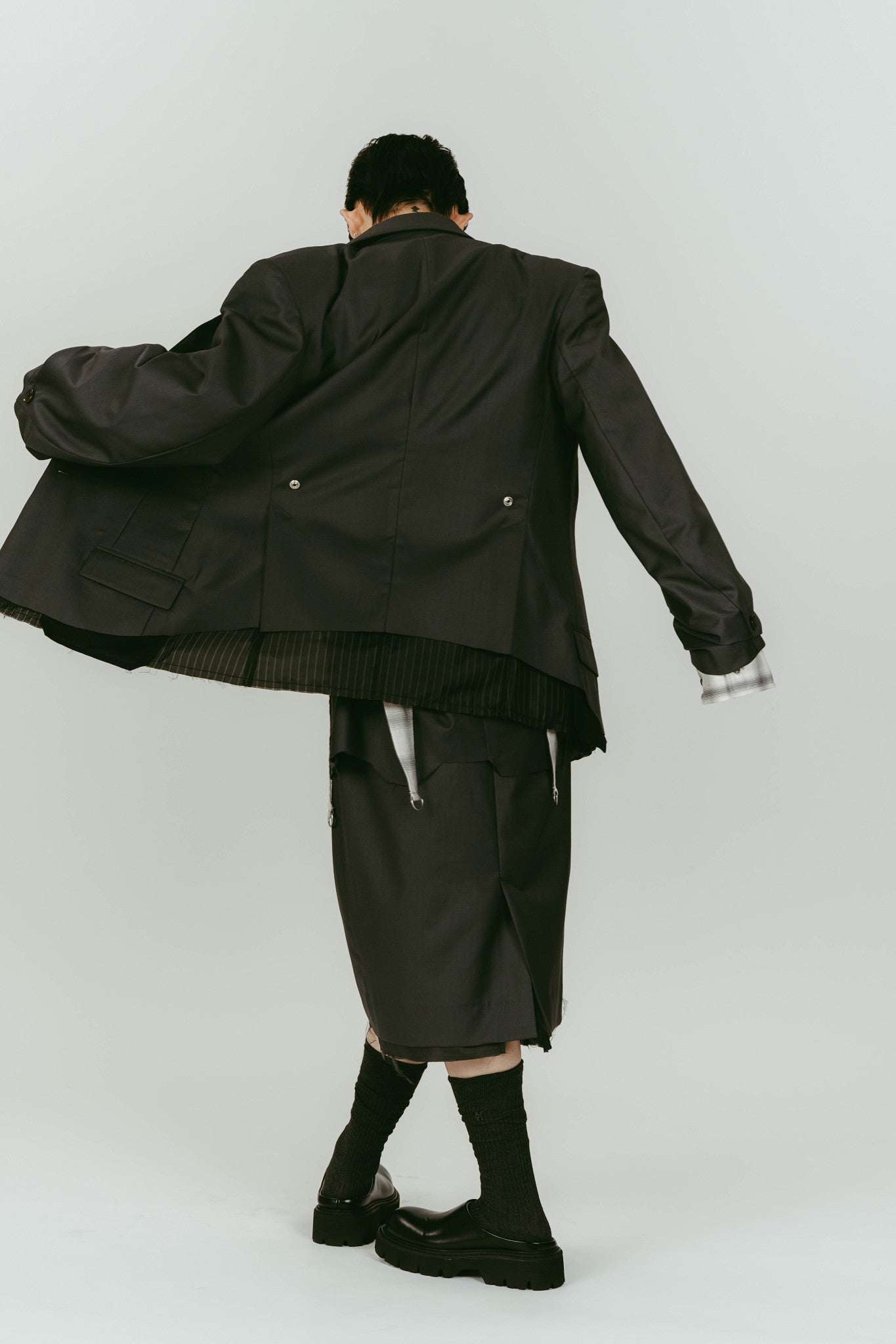 ボディピアスのディテールを添えたジャケット。